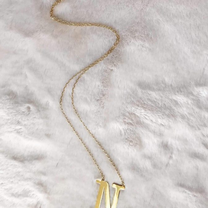 長めのチェーンのイニシャルネックレスは、ざっくりと羽織ったニットやTシャツに合わせると目を引くアクセントになります。ありそうでないイニシャルネックレス。若者からご年配のお客様まで幅広くお使い頂ける人気商品です。